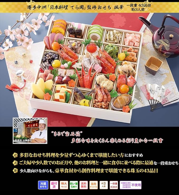 「博多中洲 てら岡監修おせち 楓華」は、一段重ながら43品目を詰め込んだ豪華仕様で、冷蔵盛付済・解凍不要という利便性を兼ね備えたおせちです。博多らしい明太子料理や海鮮の鮮度が際立ち、少人数でも満足できる構成。