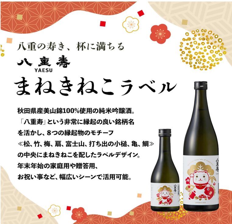 「八重寿 純米吟醸 まねきねこラベル」は、秋田県の老舗・八重寿銘醸が手掛ける限定デザイン日本酒です。